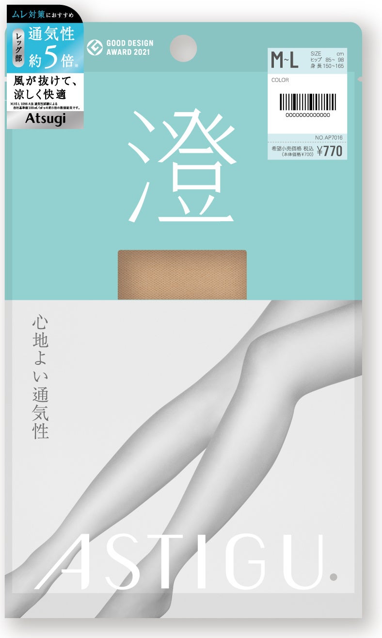 アツギ株式会社(本社:神奈川県海老名市、代表取締役社長:日光信二)は、 2026年春夏シーズン新商品として「ASTIGU/アスティーグ」のプレーンストッキング「【澄】心地よい通気性」を発売いたします。アスティーグ【澄】(読み方:スミ)のレッグ部は自社基準値に対して約5倍(※)の通気性を持つ生地で着用時のムレを軽減します。さらに吸汗加工を施したため猛暑も快適な商品です。店頭では2026年3月中旬より順次展開いたします。(※JIS L 1096 A法 通気性試験による自社基準値100㎤/(㎠・s) の約5倍の数値結果です。)