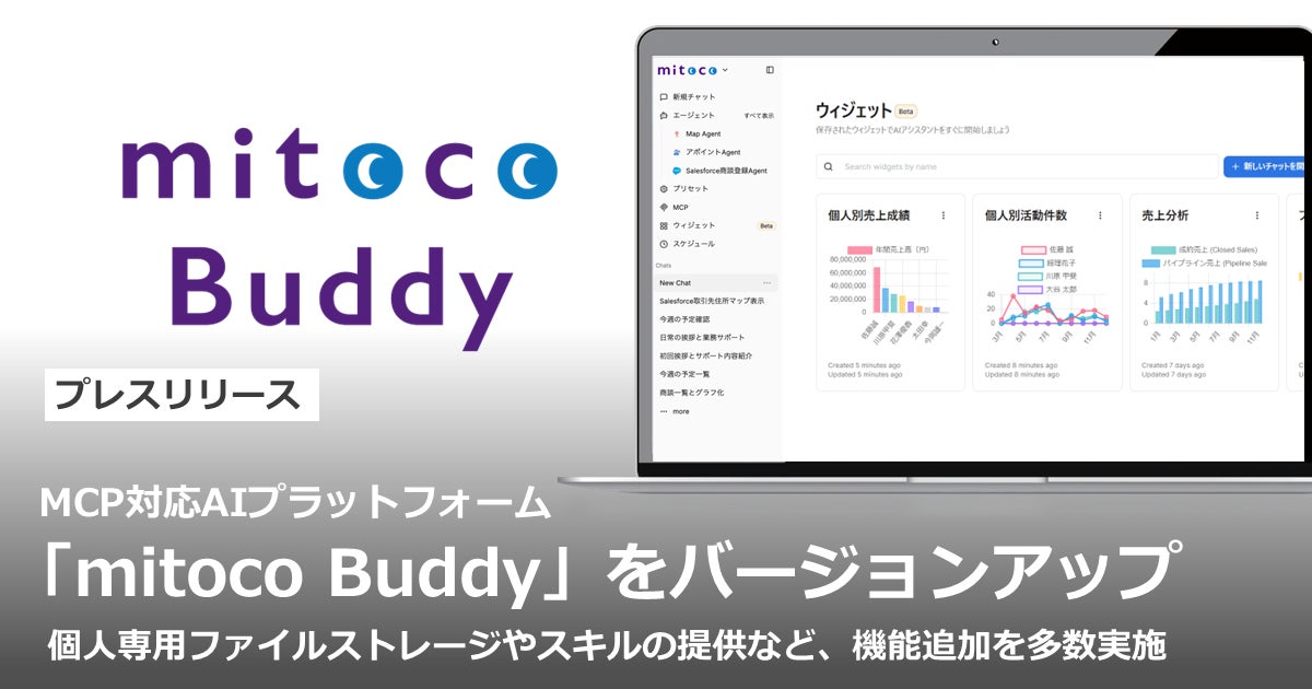 株式会社テラスカイ(本社:東京都中央区、代表取締役CEO 社長執行役員:佐藤 秀哉、以下「テラスカイ」)は2026年1月14日(水)に、MCP(Model Context Protocol)対応のAIプラットフォーム「mitoco Buddy」のバージョンアップを実施しました。