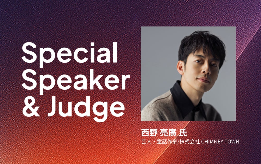基調講演には、芸人・童話作家として活動するほか、株式会社 CHIMNEY TOWNの代表取締役社長としてエンターテインメントビジネスを展開する西野亮廣氏が登壇します。また、ピッチ大会では複数の企業経営者・事業責任者が審査員として参加し、事業性・市場性・将来性の観点から評価を行います。