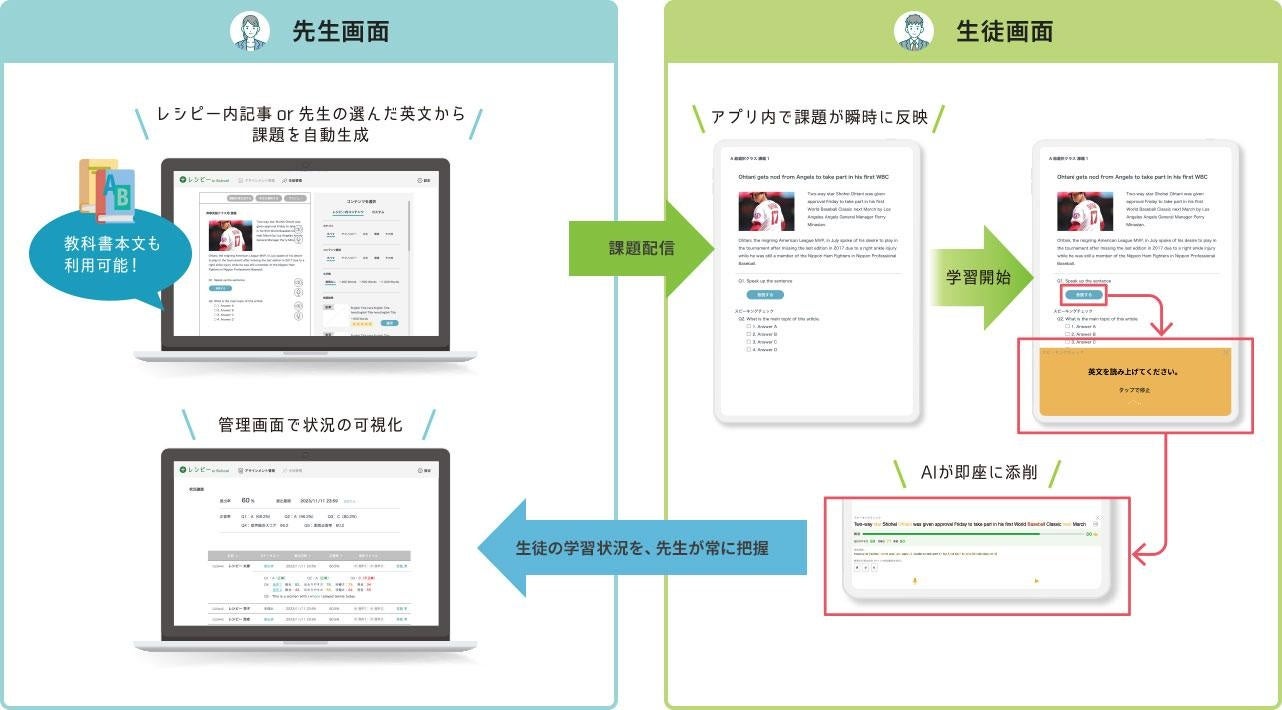 『レシピー for School』内の記事や動画コンテンツ、あるいは教科書や先生の選んだ記事を入力するだけで、授業や宿題に活用できる単語や内容理解の問題、ライティング・ディスカッションのトピックなどをAIが自動で生成します。この機能により、問題作成や採点、さらに生徒ごとの学習の進捗状況といった先生の負担が大幅に軽減されます。