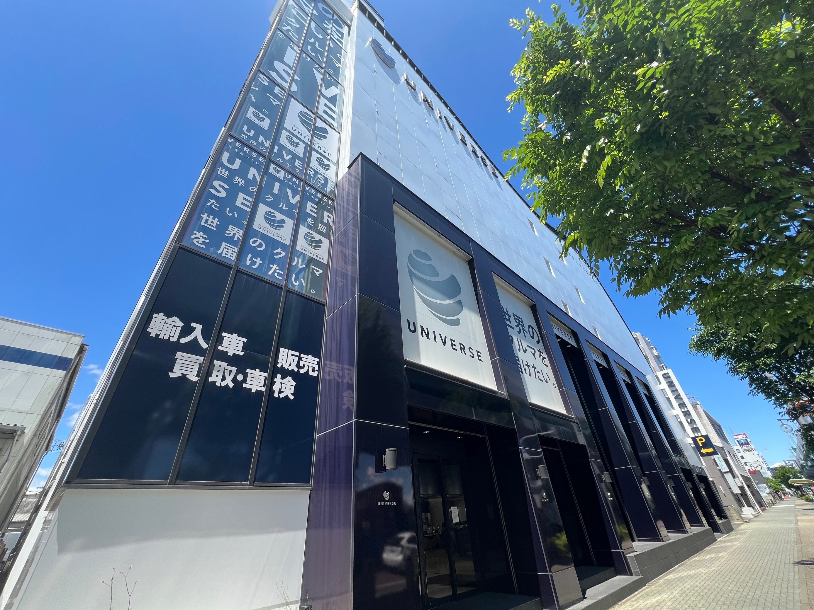 ユニバース名古屋は、中古輸入車のみを取り扱うコンセプトの専門店で、在庫台数は250台以上を誇る大型専門店です。店内は、クルマのホイールやエンブレムをイメージした幾何学模様をモチーフとして、クールな中にも温かみのあるデザインが施されています。