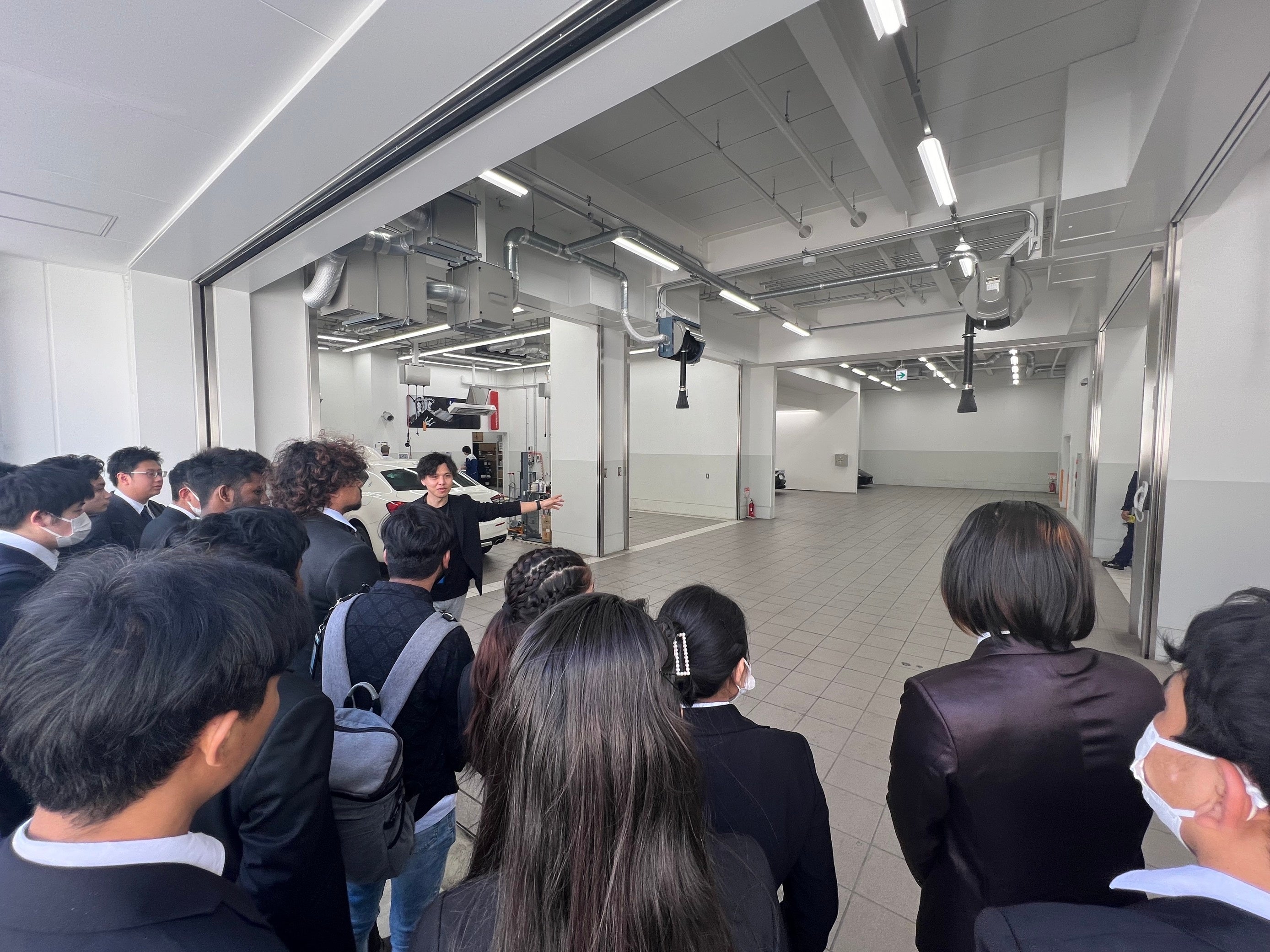 今回の職場見学では、将来の職場になり得る自動車販売店の整備工場の見学を通して、改めて整備士としての就業意欲を高めてもらうことや、整備士として働くスタッフとの交流、学校にはない最新設備の見学によって学生の知識向上を図ることを目的として実施しました。