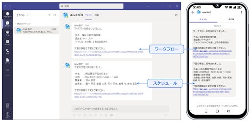 今回の連携対応により、「ArielAirOne」に登録された会議予定やワークフロー承認依頼等の情報は「Microsoft Teams」のチャット上でも通知されるようになります。複数のシステムを往来することなく、リアルタイムで情報確認ができ、複数システムを巡回する煩わしさを解消します。