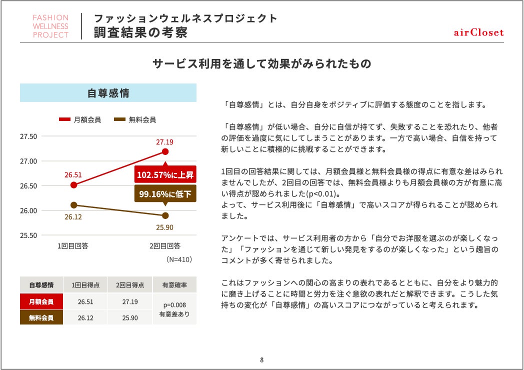 「Fashion Wellness Project」では、ファッションが心の健康状態にポジティブな変化をもたらし、日常がより豊かになっていく効果について、月額制ファッションレンタルサービス『airCloset』の体験を通し、心理学にもとづく調査と分析・考察を行いました。その結果、「自分に対するポジティブな評価」や「ありのままの自分を受け入れる気持ち」、「自分が感じる幸福感」、「自分が感じる生活の満足度」を高めるという効果が認められました。その中でも特に、自己の能力や特性に対する積極的で前向きな態度のことを指す「自己受容」において、高いスコアが出ています。これは、『airCloset』のサービスが持つ、一人ひとりの雰囲気や体型、お悩みに合わせたパーソナルスタイリングにより、自分の体型や肌の色などの生まれ持った特徴を活かせるということが、「自己受容」に良い影響を与えていると考えられます。一方で、周囲の人との関わりや自分の置かれた状況への影響は実証されませんでした。本調査の詳細は、以下「ファッション体験によるウェルビーイングに対する効果」に関するホワイトペーパーにて公開しております。