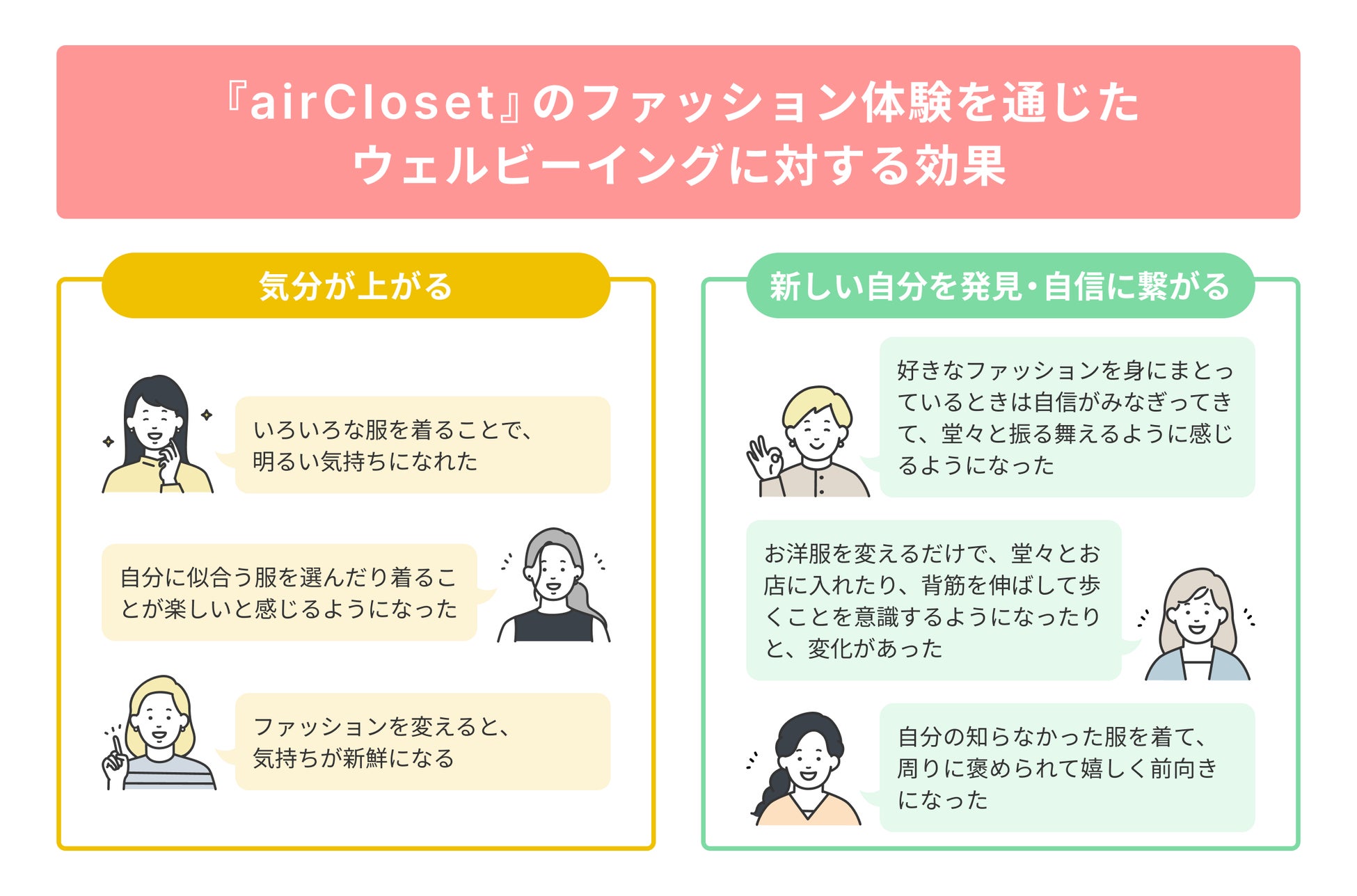 本プロジェクトを通して『airCloset』は、コスト・タイムパフォーマンスの高いサービスとしてだけでなく、心理的な面からもお客様の日々の生活を豊かにすることに貢献できていることが科学的に実証されました。今後も、様々なシーンで「ワクワクするファッションとの出会い」の体験を提供し続けていきます。