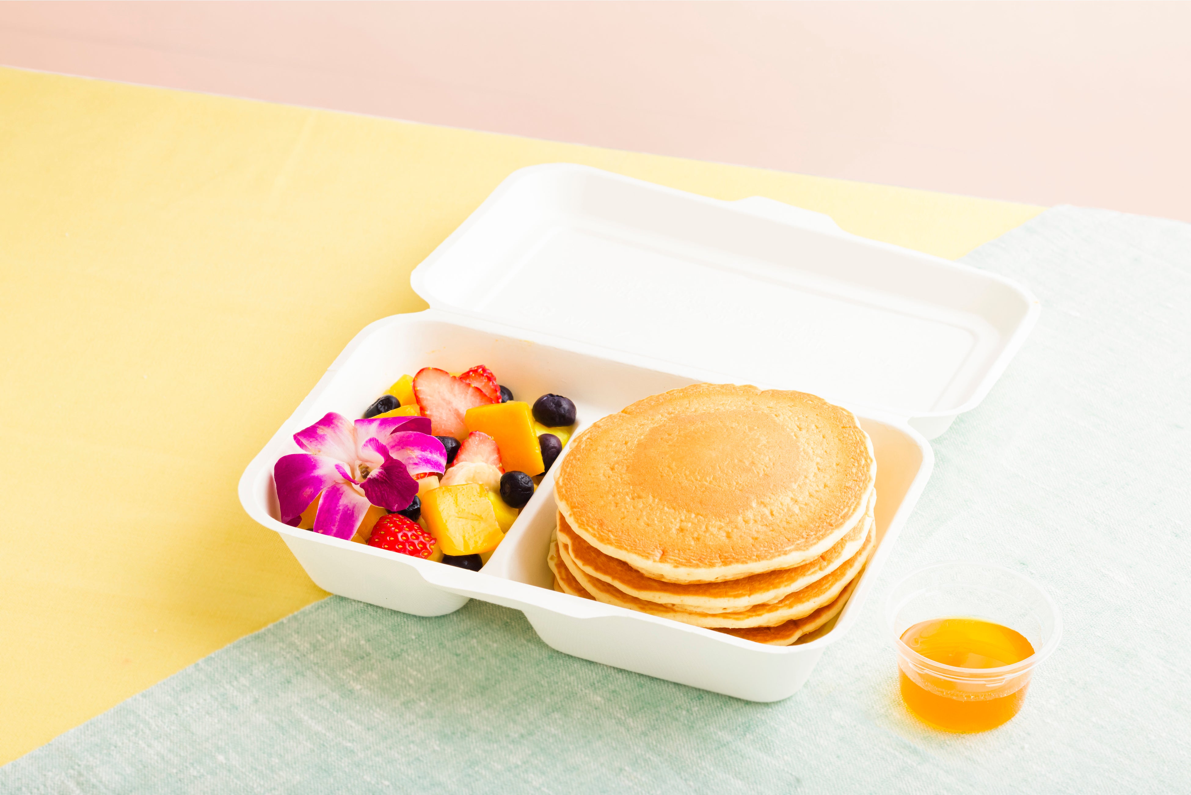 マンゴーやパイナップルなど5種のフルーツをたっぷり盛り付けたパンケーキ