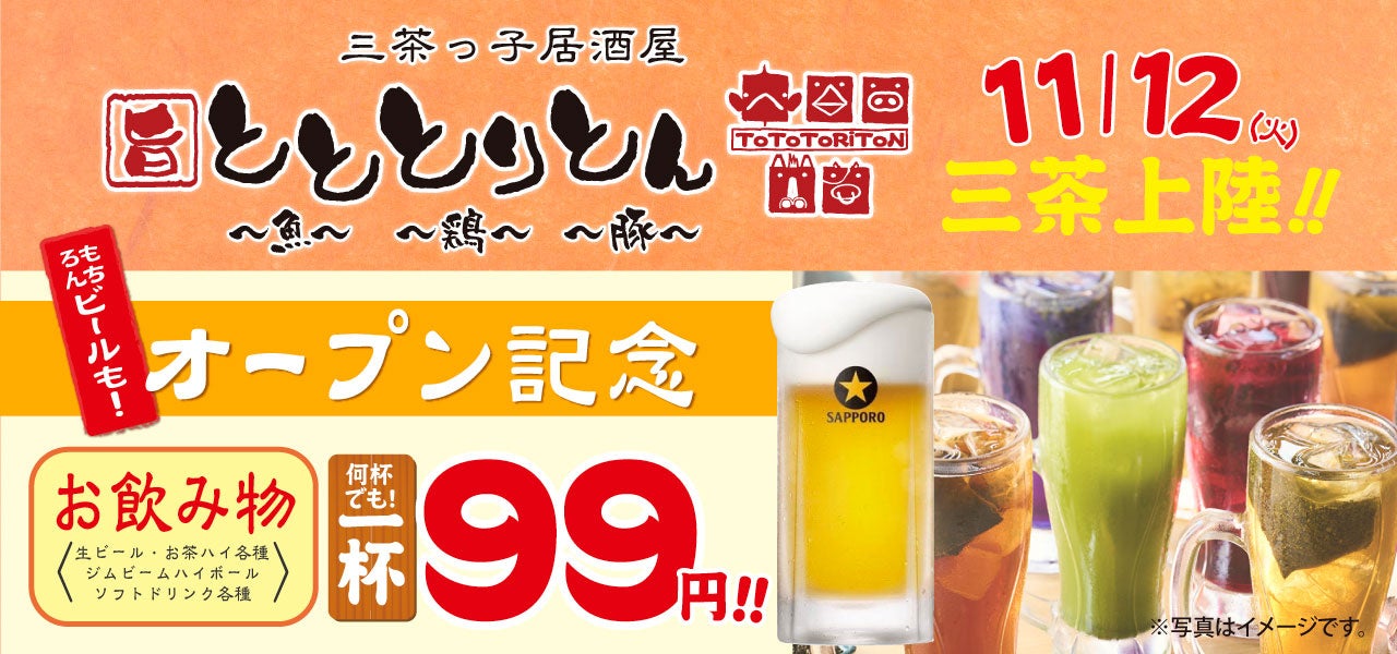 オープン記念のご挨拶価格として、生ビール、各種お茶ハイ、ハイボール、ソフトドリンクを何杯飲んでも99円でご提供します!