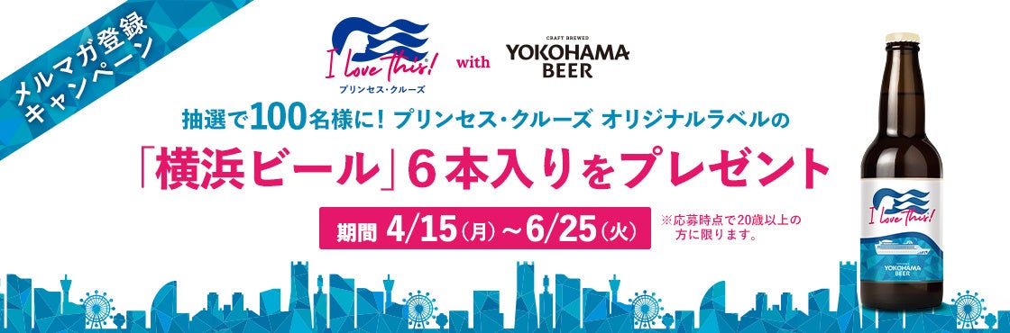 プリンセス・クルーズ(https://www.princesscruises.jp/)は、横浜市内にあるクラフトビール醸造所「横浜ビール(https://yokohamabeer.com/)」とのコラボレーション企画第二弾として、キャンペーン期間中にメールマガジン「プリンセス・メール(https://www.princesscruises.jp/mail-member/)」に新規ご登録いただいた方の中から抽選で100名様に、横浜ビールのピルスナーが当たる「プリンセス・クルーズ オリジナルラベル 横浜ビール プレゼントキャンペーン」を開催いたします。キャンペーンの詳細は「プリンセス・クルーズ オリジナルラベル 横浜ビール プレゼントキャンペーン(https://www.princesscruises.jp/mail-member/)」ページをご確認ください。
