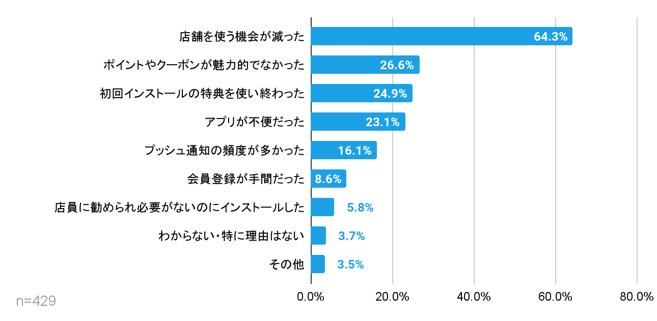 アンインストール理由は、「店舗を使う機会が減った(64.3%)」がもっとも多い結果に。ほかにも「ポイントやクーポンが魅力的でなかった」「初回インストールの特典を使い終わった」「アプリが不便だった」という回答が続きました。