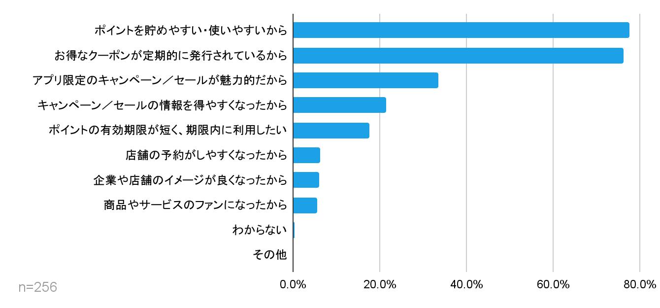 また、「インストール特典を利用するため(26.1%)」「いつも利用している店舗だから(24.6%)」といった理由も続いており、ユーザーは店頭でアプリをどう活用できるのかを想定したうえでアプリをインストールする傾向があるといえます。