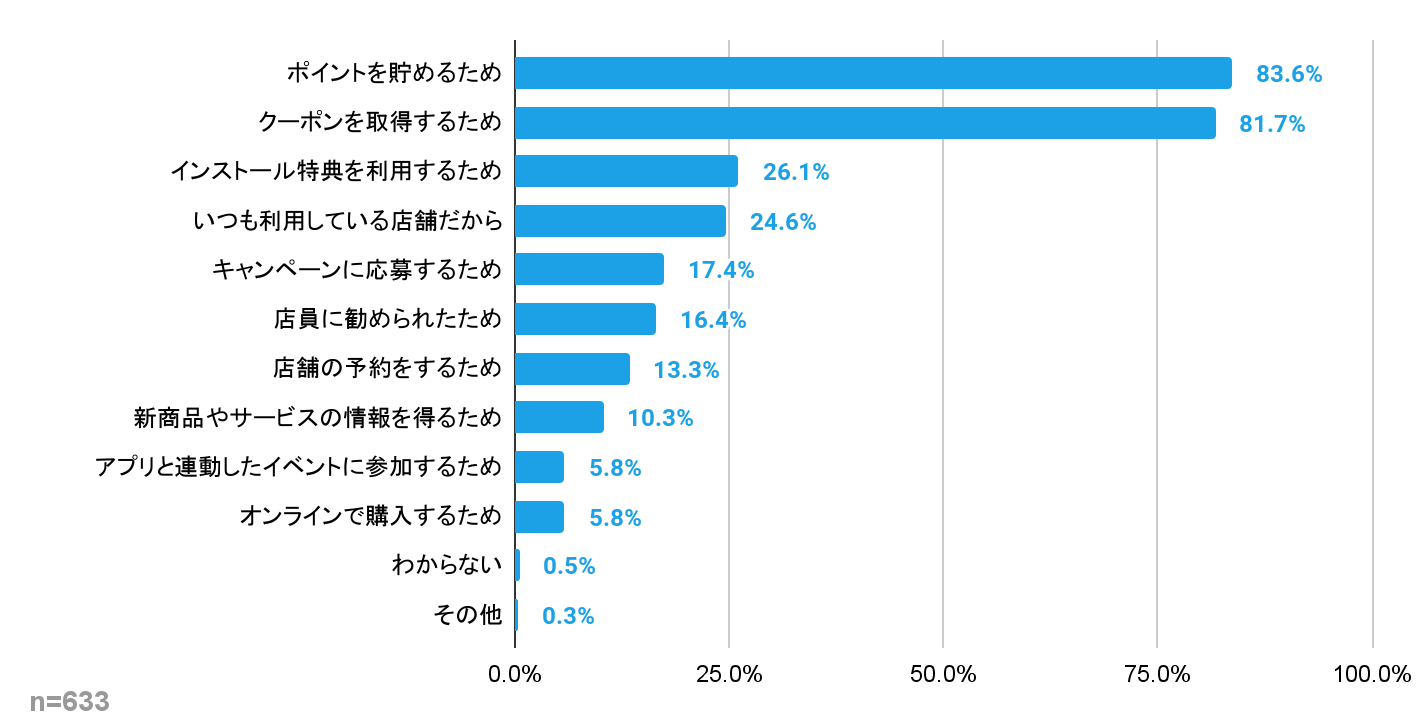 店舗アプリをインストールした理由・きっかけを尋ねると、「クーポンを取得するため」「ポイントを貯めるため」が上位に挙がりました。
