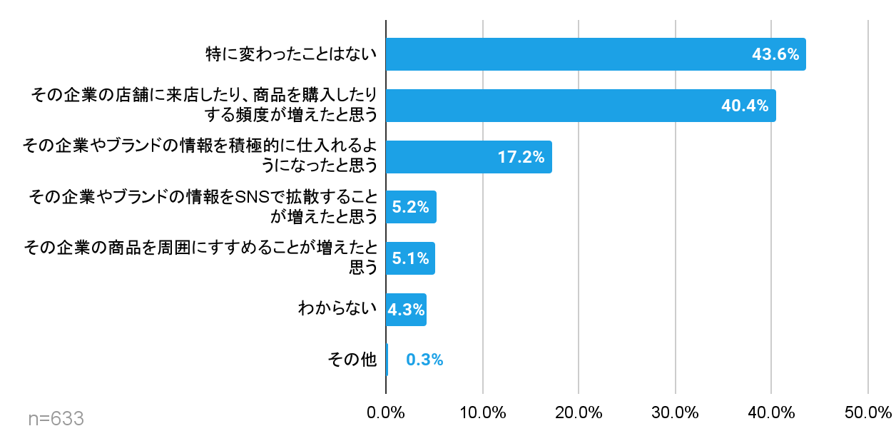アプリをインストールする前後で行動の変化があったかどうかを尋ねると、「特に変わったことはない」という回答がもっとも多い結果になりました。ただ一方で、40.4%の人が「その企業の店舗に来店したり、商品を購入したりする頻度が増えた」と回答しています。