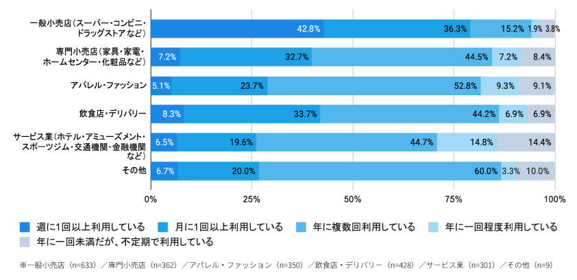 業種別で比較すると、一般小売店のアプリ利用頻度は他と比べて圧倒的に高くなっています。スーパーやコンビニなどの小売店はユーザーが日常的に利用するものであり、来店頻度とアプリの利用頻度は比例することがわかります。