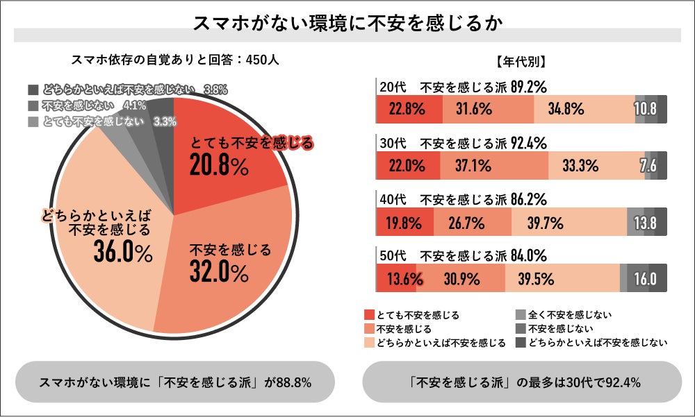 スマホ依存の自覚ありと回答した450人にスマホがない環境に不安を感じるかを聞くと「不安を感じる派」が88.8%で大多数を占め、内訳は「とても不安を感じる」20.8%、「不安を感じる」32.0%、「どちらかといえば不安を感じる」36.0%でした。年代別では30代の「不安を感じる派」が92.4%で最多となり、次いで20代が89.2%、40代が86.2%、50代が84.0%という結果になりました。