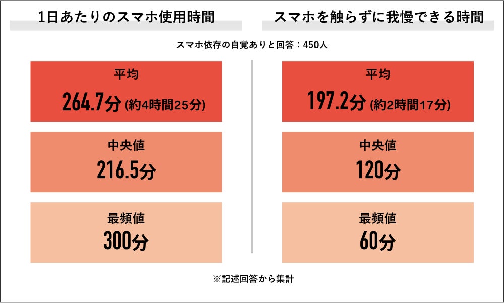 スマホ依存の自覚ありと回答した450人に1日のスマホ使用時間を聞くと、平均が264.7分(約4時間25分)、中央値が216.5分、最頻値は300分でした。また、スマホを触らずに我慢できる時間を聞くと、平均が197.2分(約2時間17分)、中央値が120分、最頻値は60分でした。
