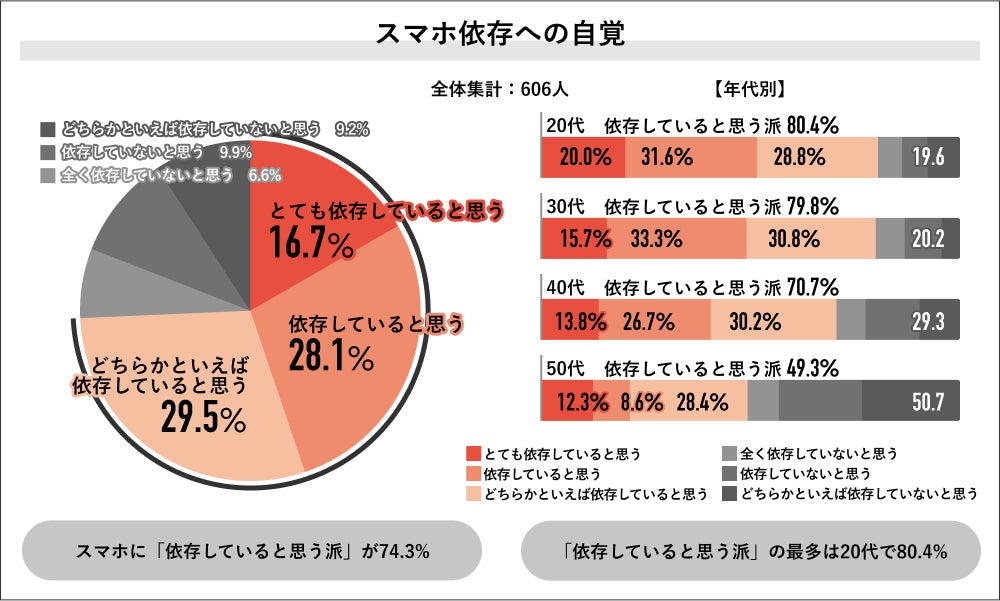 回答者全体の606人にスマホに依存にしているかを聞くと「依存していると思う派」が74.3%で過半数を占め、内訳は「とても依存していると思う」16.7%、「依存していると思う」28.1%、「どちらかといえば依存していると思う」29.5%でした。年代別では20代の「依存していると思う派」が80.4%で最多となり、次いで30代が79.8%、40代が70.7%、50代が49.3%という結果になりました。