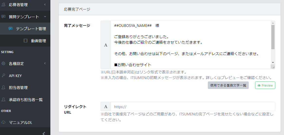 人材派遣会社に多く利用されている録画面接ツールITSUMEN(イツメン)は、管理画面における応募完了後ページ設定のUIを変更しました。