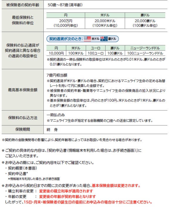マニュライフ生命保険株式会社(取締役代表執行役社長兼CEO:ブノワ・メスレ、本社:東京都新宿区、以下「マニュライフ生命」)は4月1日より、通貨選択型一時払終身保険『未来につなげる終身保険』の契約年齢の下限を従来の60歳から10歳引き下げ、50歳からに拡大します。