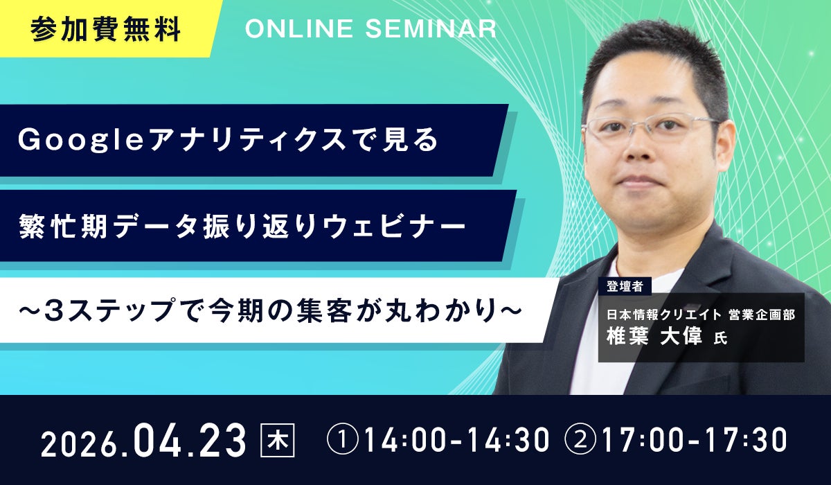 不動産テックを推進する日本情報クリエイト株式会社(本社:宮崎県都城市、代表取締役社長:辻村 都雄、証券コード:4054)は、2026年4月23日(木)に、不動産会社様向け無料オンラインセミナー『Googleアナリティクスで見る、繁忙期データ振り返りウェビナー〜3ステップで今期の集客が丸わかり〜』を開催いたします。