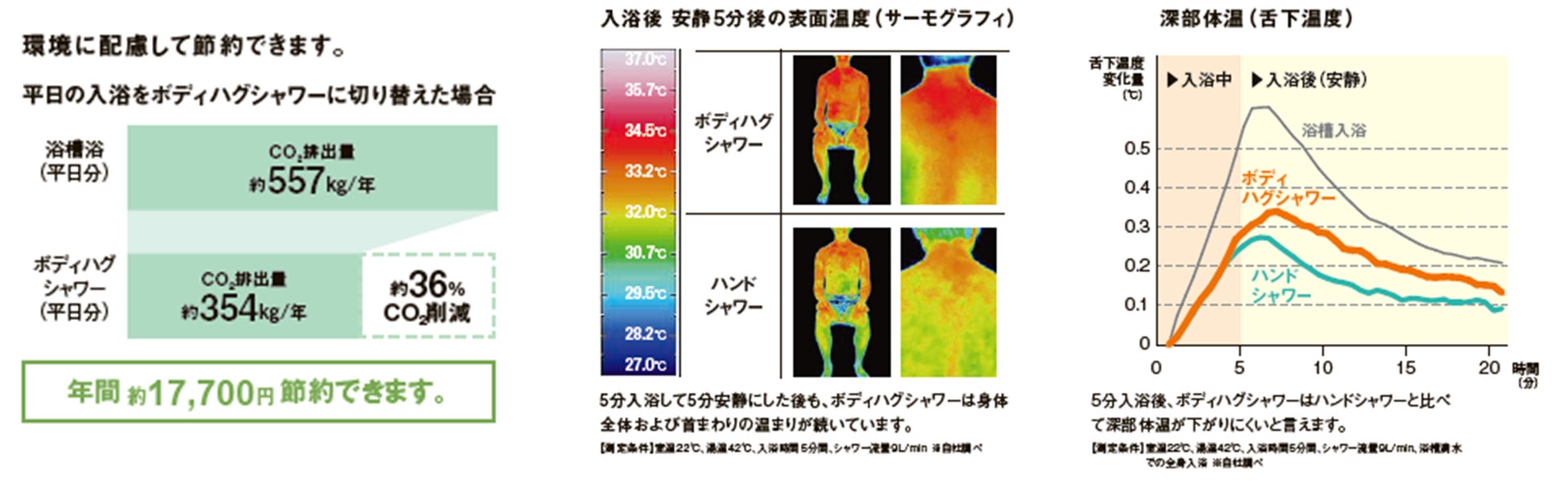 シャワーユニット「NS」も今回リニューアルいたします。大浴場があるホテルや、インバウンド配慮で浴室のないホテル水回り空間も増加している中、浴槽がなくとも体を温めて、しっかり旅の疲れを癒せるようにボディハグシャワーをオプション設定に追加いたします。ボディハグシャワーはハンドシャワーと比べ深部体温が下がりにくく、しっかり体を温めることができ、また浴槽浴に比べると使用水量も抑えることができ、より快適かつエコな浴室空間を実現します。
