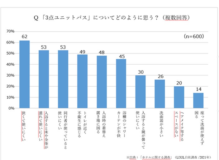 また当社の調査によると、ホテルの一般的な狭小3点ユニットバスでは、“シャワーカーテンが体に張り付くのが深い”、“同行者が入浴中に、トイレ・洗面が使いにくい”、“入浴・脱衣の時にトイレが近い”、“狭くて、衣類やタオル置き場がない”、“カーテンで脱衣場床が濡れてしまう”、などストレスを感じているようです。