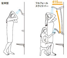 くつろぎながら普段と同様に座ってシャワーを浴びることができるよう、水栓金具の位置を低めに設定しているタイプ。手軽にオーバーヘッドシャワーの心地よさを味わえるフルフォールシャワーやカンタンに壁から外して、とるピカカウンターなども装備が可能。狭小空間においても、快適な入浴を実現できる空間にしました。