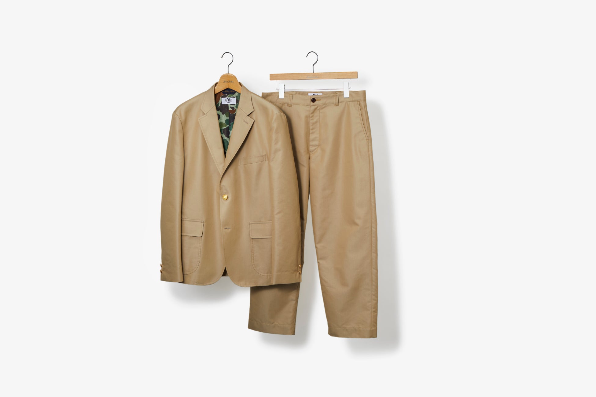 ブレザーは、ブルックス ブラザーズを代表するウエストの絞りのないボックス型の段返り3釦センターベントのトラディショナルサックモデルをベースに、コットンポリエステルのギャバジン生地を使用しeYe JUNYA WATANABE MANのパターンで仕上げました。ライナーには迷彩柄のメッシュを配し、腰ポケットはパッチ&フラップ仕様でカジュアルスタイルを表現しました。ブレザー同様のコットンポリエステルのギャバジン生地を使用したトラウザーズのシルエットはJUNYA WATANABE MANアーカイブからのチノパン型を採用。ショーツは、ミリタリーパンツのデティールをベースにアレンジしました。いずれもブレザーとセットアップでの着用可能です。