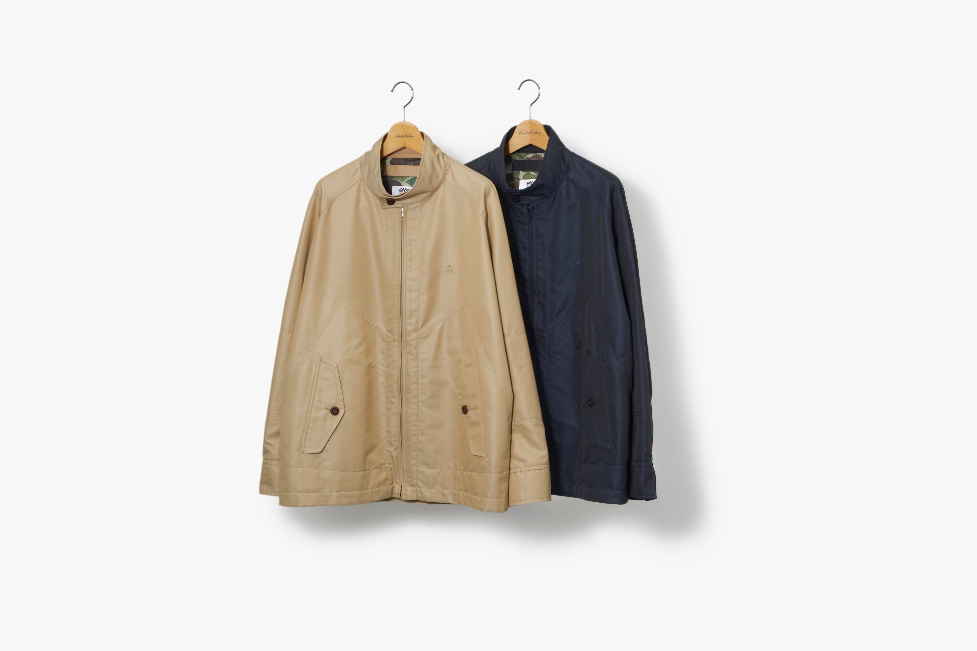 ドッグイヤーカラー、アンブレラヨーク、そして裏面にポケットワークを施したデザインが特徴的なブルゾンは、ベージュとネイビーの2色展開。ライナーには迷彩柄のメッシュを配し、左胸に配されたトーナルカラーのゴールデン フリースがあしらわれたデザインです。