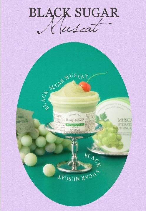 (写真中央:ブラックシュガー パーフェクト エッセンシャルスクラブ 2X マスカット、右:マスカット ハイドレーティング スージングジェル)