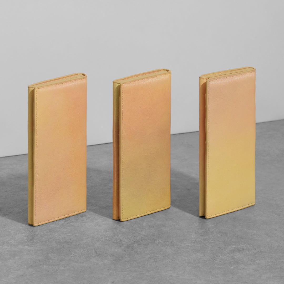 2023年に開催された「モネ 連作の情景」展をきっかけに生まれた、モネとマザーハウスのコラボレーションアイテムが「モネ レザー」です。これまでのグリーン・パープルに加え、新色のイエローが仲間入りしました。