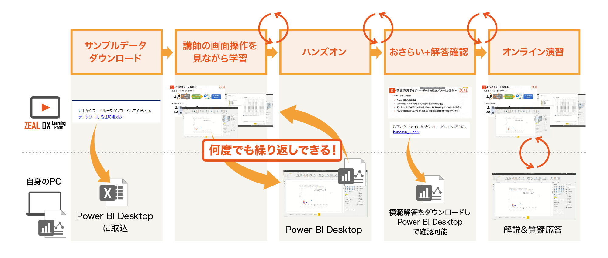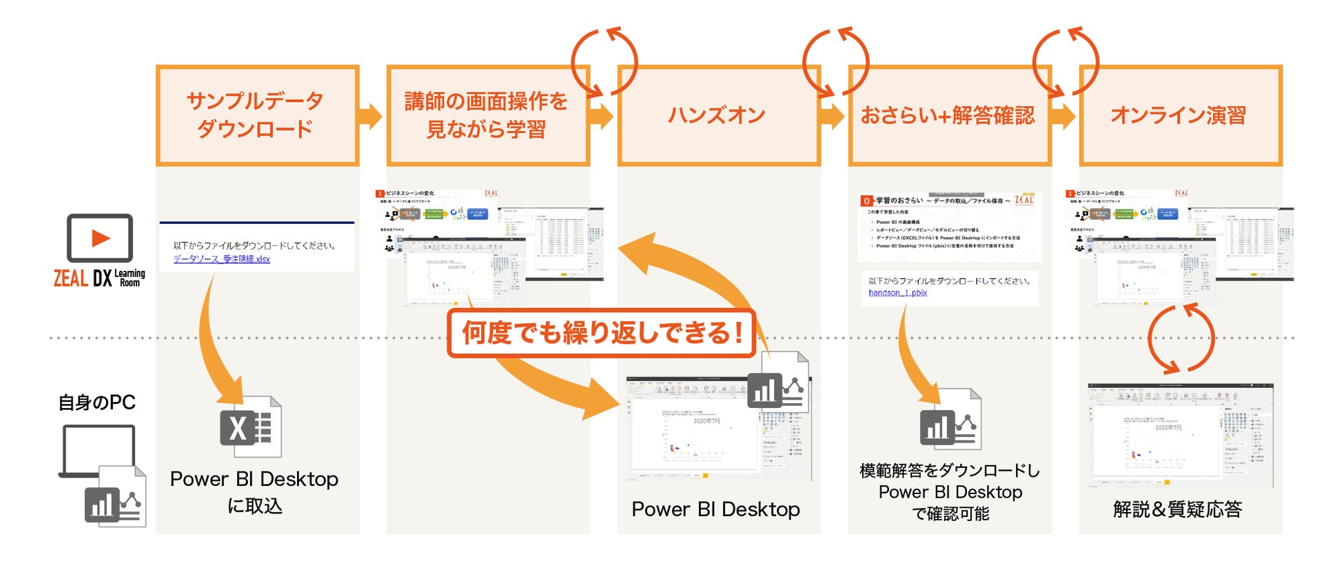 そのような中、営業企画部の担当者様がExcel中心の分析業務から脱却するために、Excelとの親和性が高いBIツールMicrosoft Power BI(以下、Power BI)の勉強を独学で開始。基本をしっかりと学びたいと思い始めたタイミングで、「すべての社員をデータドリブン人材に」をコンセプトに掲げてジールが提供するサービスであるPower BIのeラーニングDX-Learning Roomの存在を知って頂き、提案をおこないました。DX-Learning Roomにより、データ活用のスペシャリストの育成ではなく、現場部門がデータ活用のスキルを身につけることで、データ活用の裾野を広げることを目指しているということに賛同をいただき、同社の採用が決定しました。