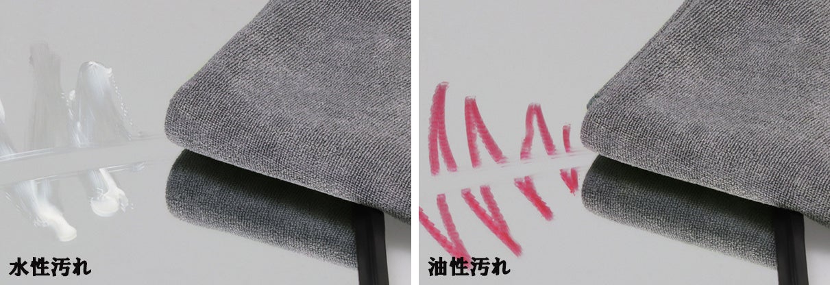 乾拭きの状態で、水性汚れ・油性汚れどちらも除去。クロスを濡らしたり、クリーナー等を付ける必要がないため、汚れが気になったときにサッと使うことができます。