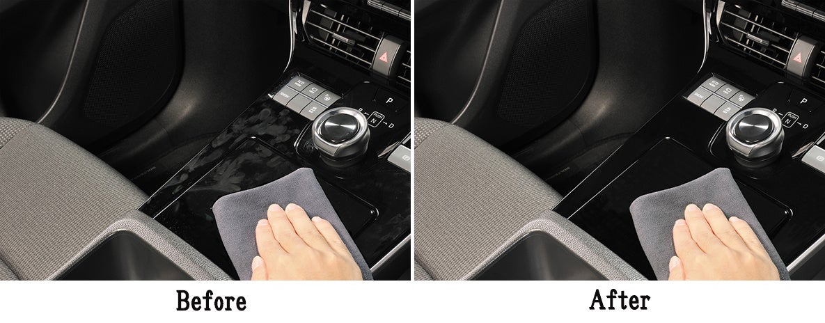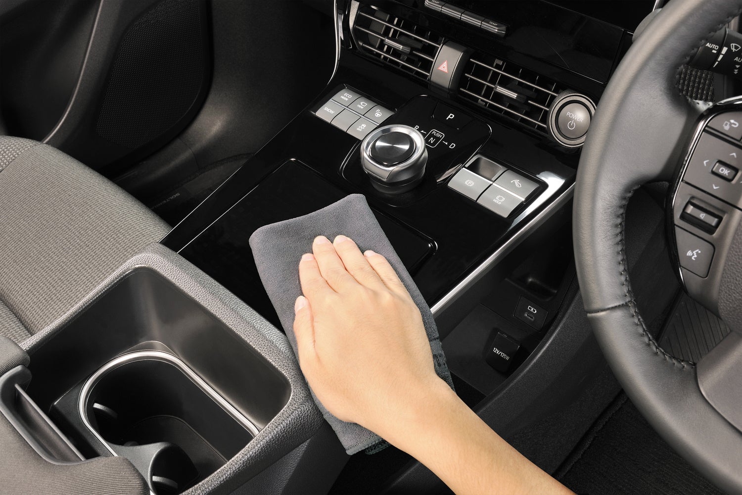 ピアノブラック調インパネ周りやナビなどのディスプレイといった、指紋やホコリが目立ちやすい場所も、ソフトな生地で優しく拭き上げます。