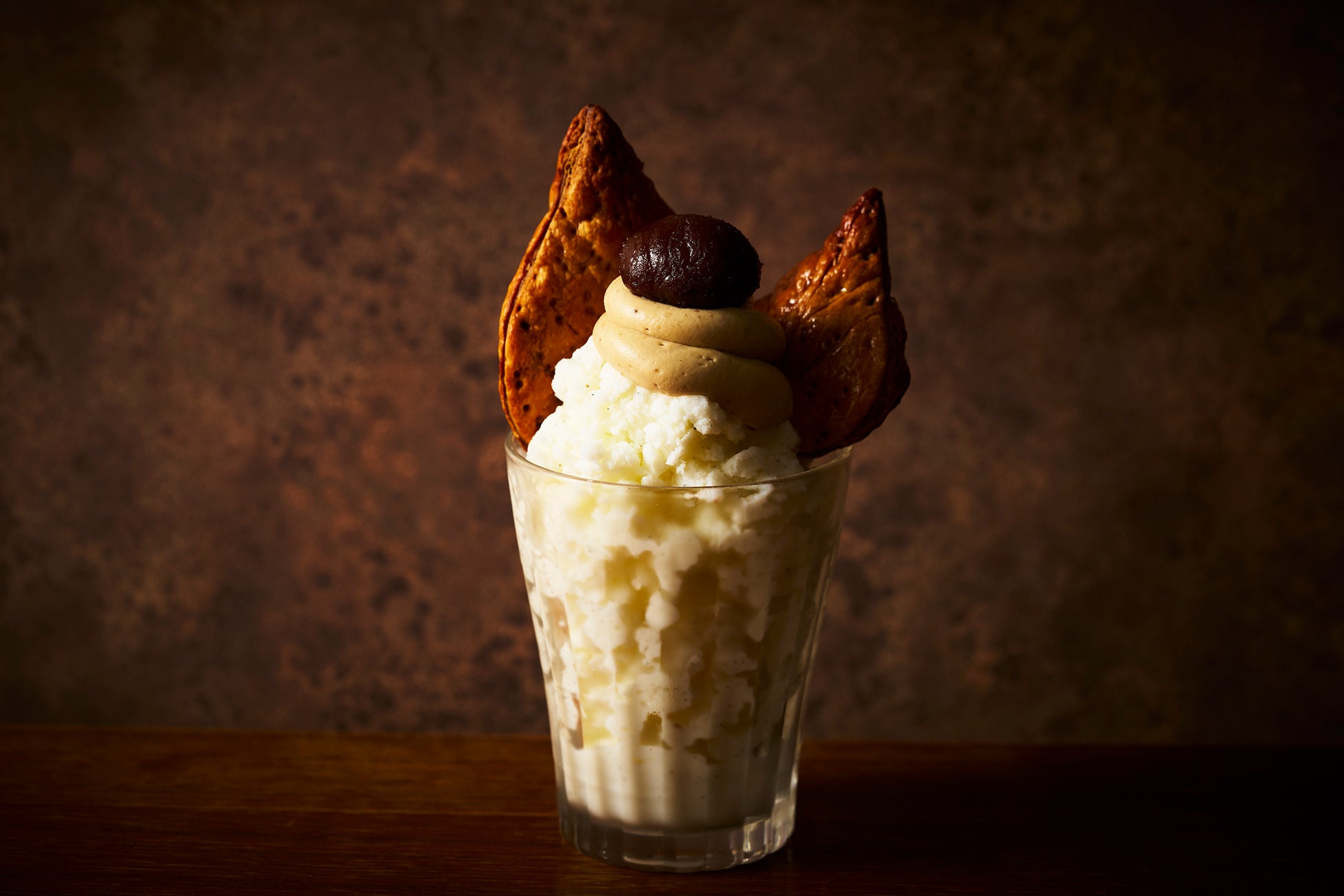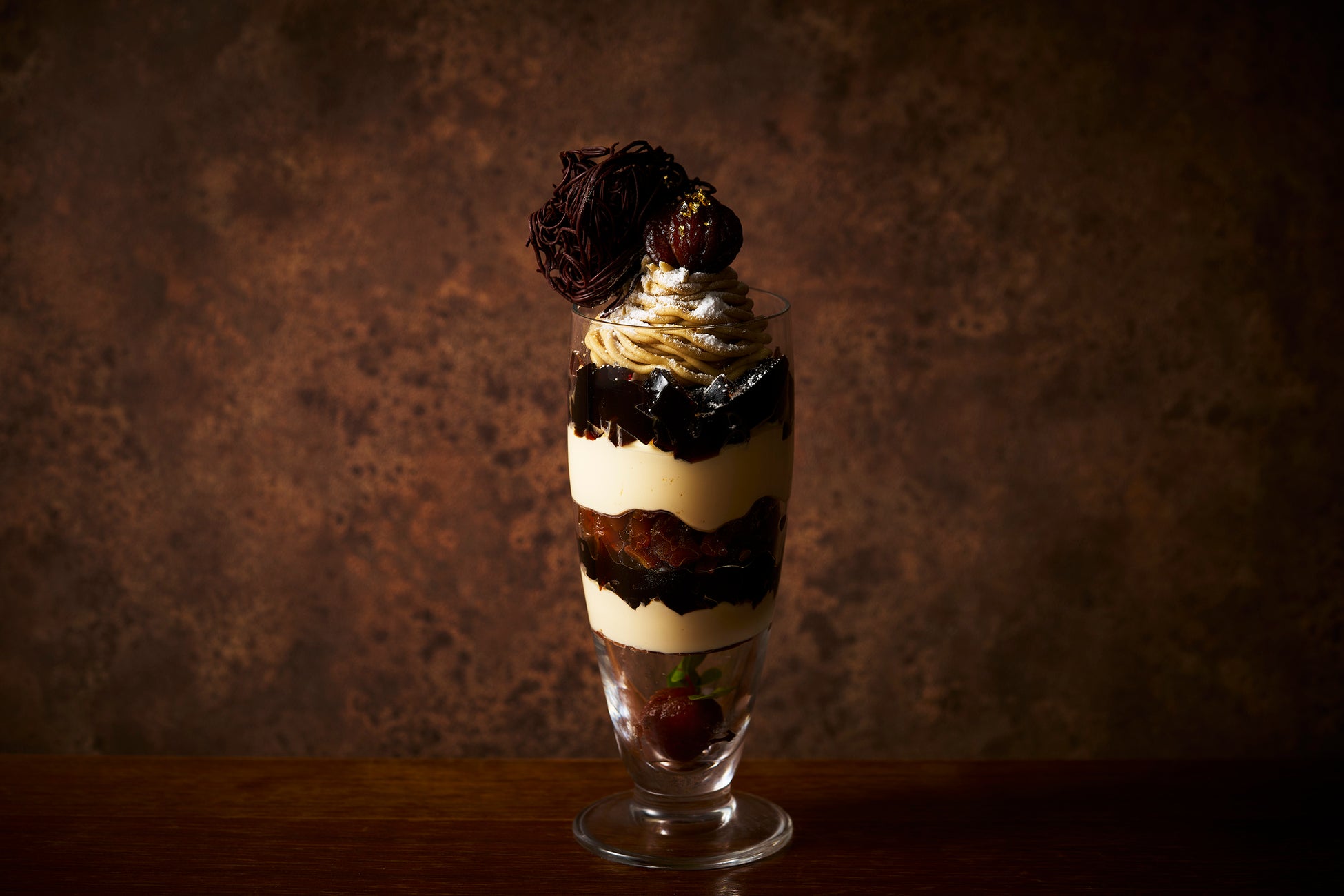 モンブラン、栗の甘露煮の上品な甘さ、滑らかな口当たりの黒糖マスカルポーネクリーム、コーヒーゼリーの苦みが絶妙にマッチするパフェ。トッピングのダークチョコレートが贅沢さを添えます。