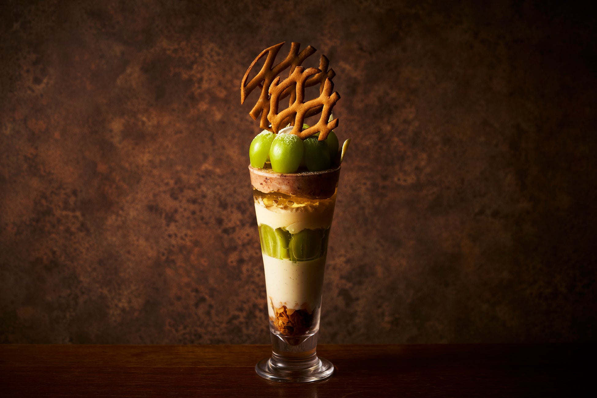シャインマスカットを贅沢に使用したプレミアムなパフェ。カスタード入り生クリーム、バニラパンナコッタ、アーモンドココア&シガレット、そして濃厚な甘味と芳醇な香りのシャインマスカットが織りなす至福の美味しさをご堪能ください。