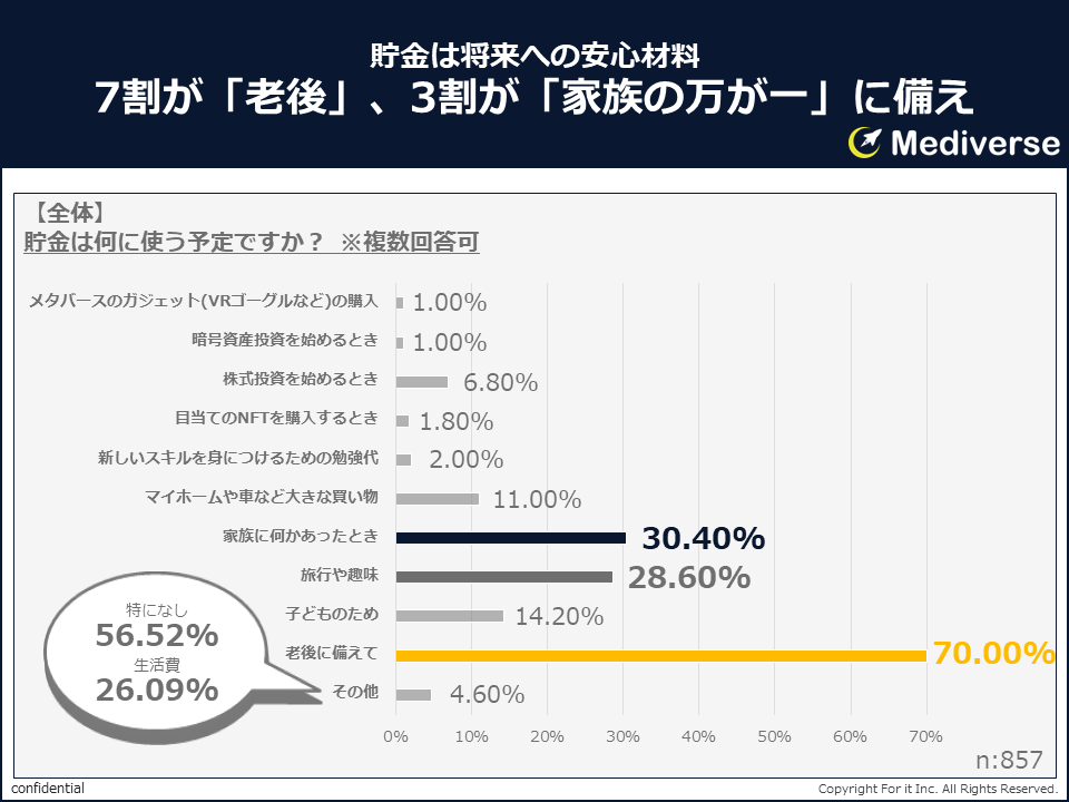 貯金の使い道として圧倒的に多かったのは「老後に備えて」70.00%であった。さらに、「家族に何かがあったとき」30.40%、「旅行や趣味」28.60%と続いており、近未来の余暇を楽しむためというよりも、将来への不安に対する安心材料として貯蓄していることがうかがえる。