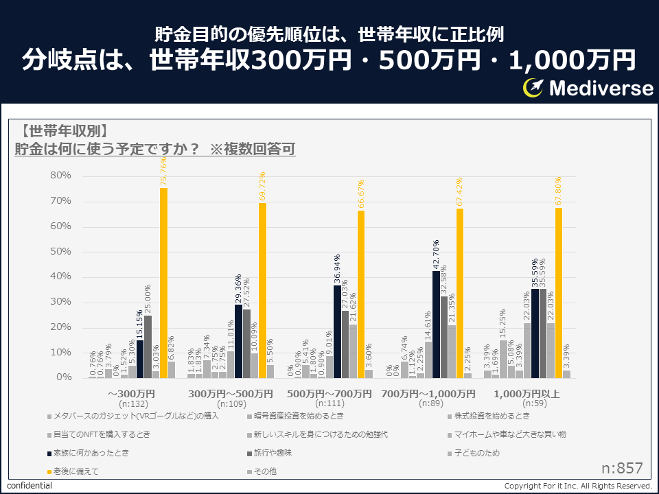 また、世帯年収500万円地点から「子どものため」の貯金が全体の2割を超えていることから、シェア率4位であるものの、子どものために意識的に貯蓄している姿勢が垣間見える。
