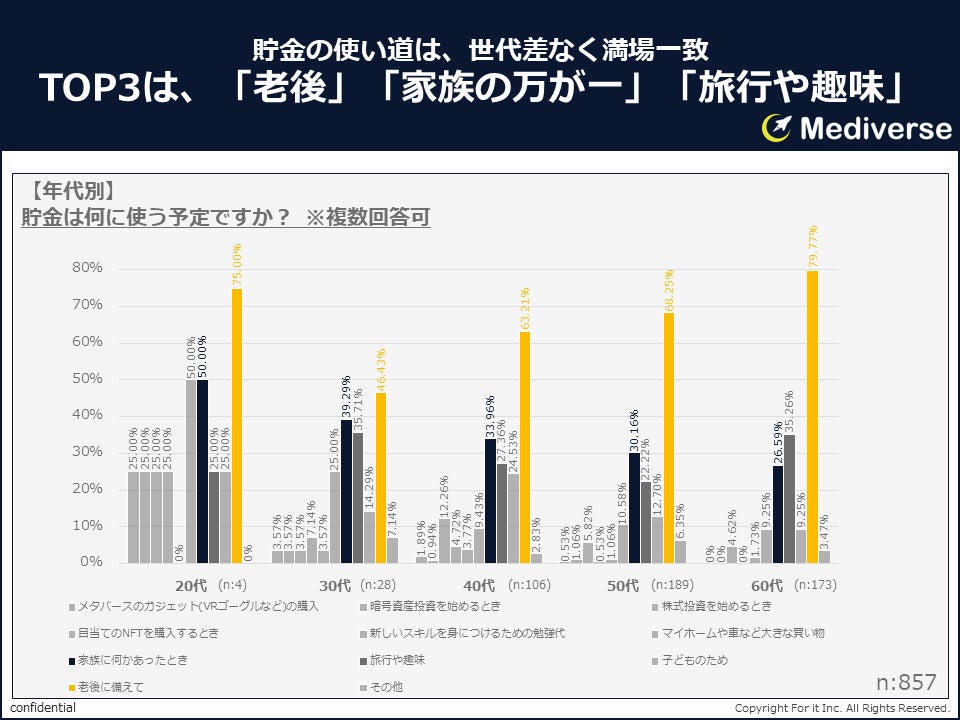 年代別に見ると、TOP3は世代差なく満場一致で、「老後に備えて」「家族に何かがあったとき」「旅行や趣味」がランクインし、首位はいずれの世代でも「老後に備えて」が抜きん出ていた。