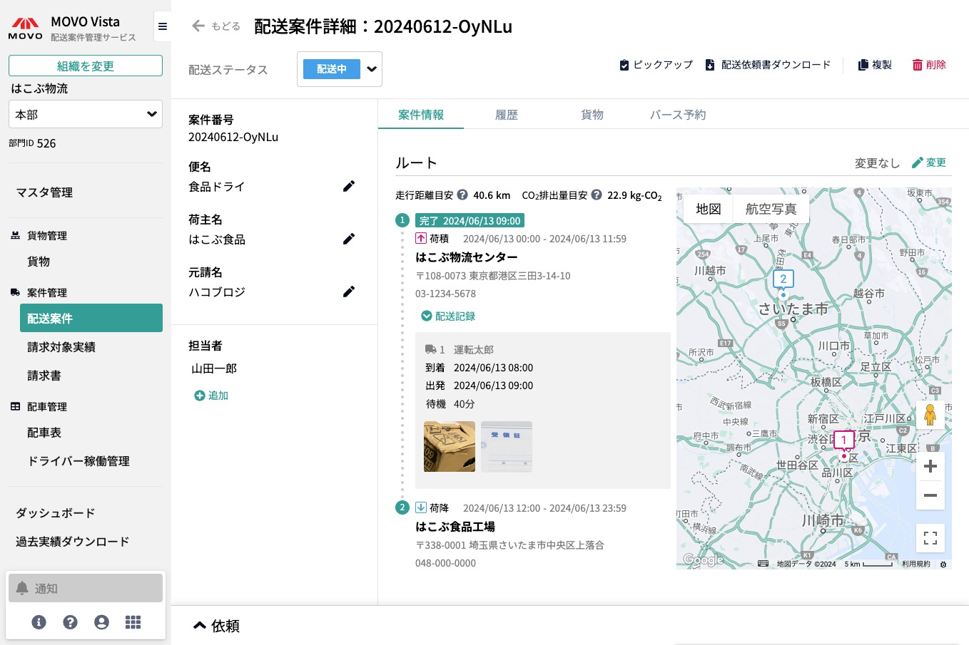 配車担当者は、MOVO Vistaの画面上で、ドライバーが登録した配送実績を閲覧することができます。配送実績に応じて画面上のステータスも「配送中」「完了」などと変わるため、リアルタイムで作業の状況を把握することが可能です。
