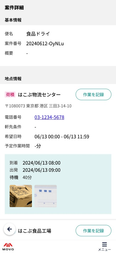 配送プロセス可視化機能の実装により、ドライバーはスマートフォンから配送実績を登録できるようになります。到着や出発の時刻、荷待ち時間を記録することが可能です。また、画像もアップロードすることができるため、貨物や積載の状況を共有できます。スマートフォンのブラウザまたは、スマートフォンアプリ「MOVO Driver」での入力が可能です。