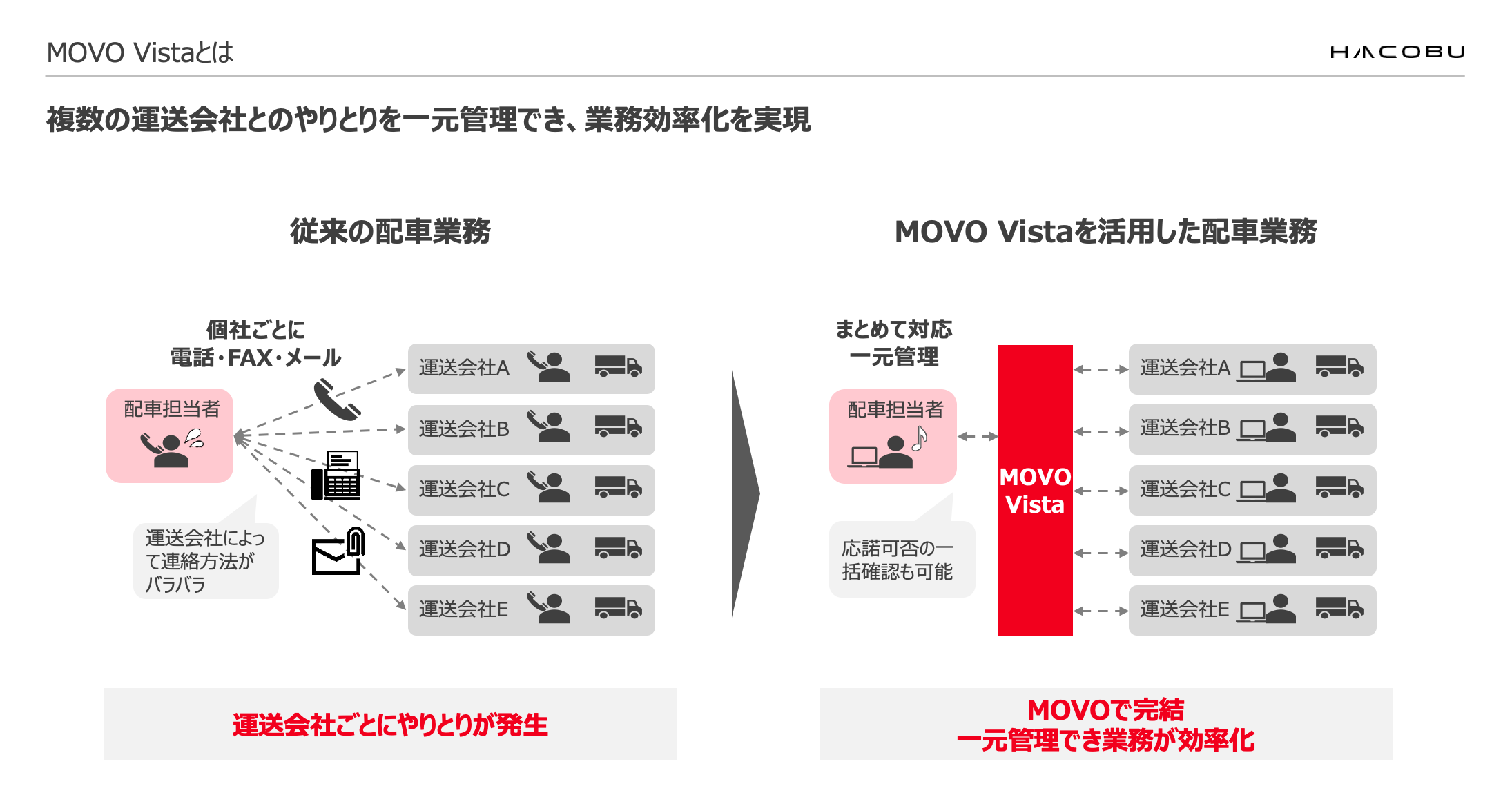 MOVO Vistaは、配送案件の管理を支援するサービスです。MOVO Vistaは、配送案件発注に関わるコミュニケーションをオンラインで行うことで、契約の書面化・電子化を実現します。配送案件の発注の都度発生していた、電話・FAX・メールでのやりとりが不要になり、業務の効率化を実現します。