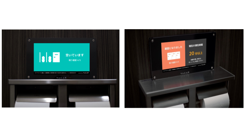 混雑具合に応じて広告の長さを自動で調整したり、滞在時間に応じて画面の表示を滞在抑制につながる表示に変更するといった、バカンがこれまでに蓄積してきた技術やノウハウから生み出した特許技術(出願中含む)が多数用いることで、お手洗いの混雑抑制とメディア化を実現しています。