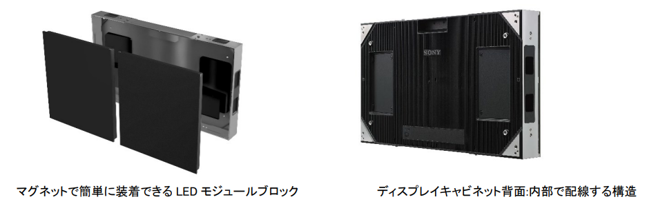 4機種ともにディスプレイキャビネット本体を新設計し、約10%(※2)の薄型化と軽量化を実現しています。また、工場出荷時に事前に組み立てられた2つのLEDモジュールブロックをマグネットで簡単にキャビネットに装着できる構造にすることで、設置作業にかかる時間を短縮し、設置性および保守性が大幅に向上しています。