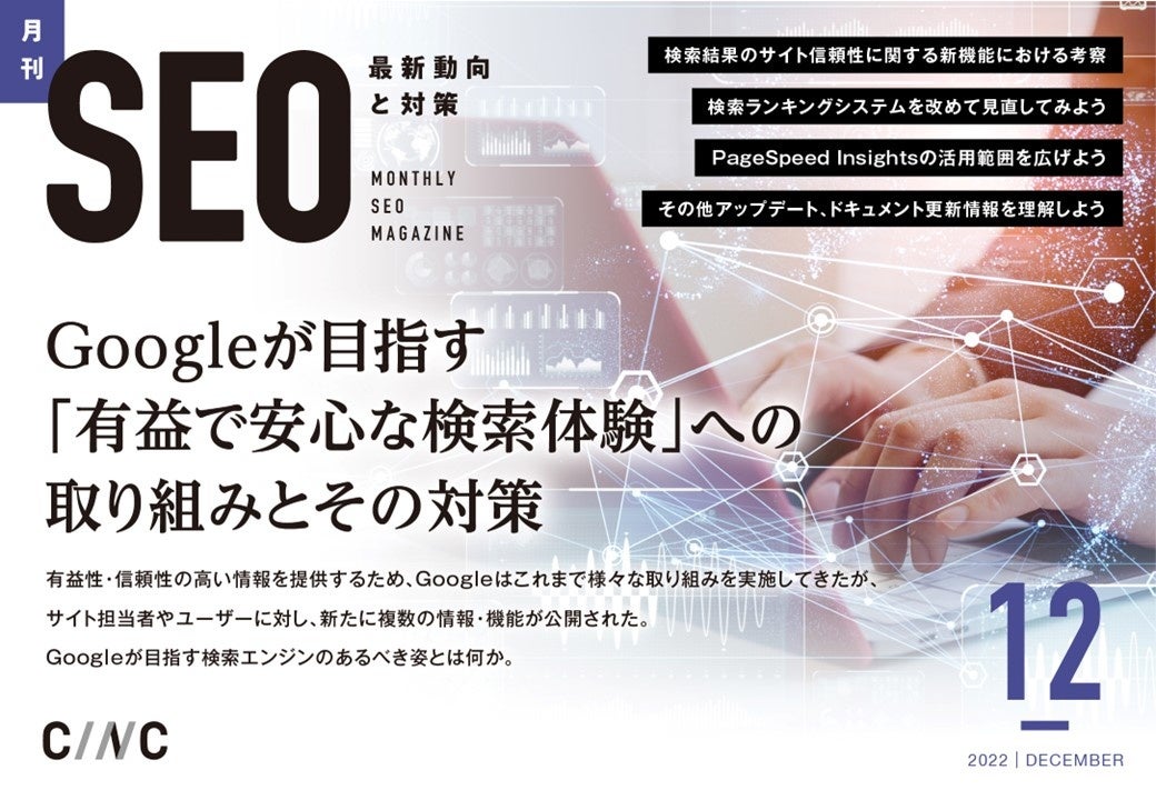 株式会社CINC(東京都港区 代表取締役社長 石松友典、以下 CINC)は、毎月特定のテーマのSEO最新動向と対策についてレポートする「月刊SEO」の12月号を公開しました。
