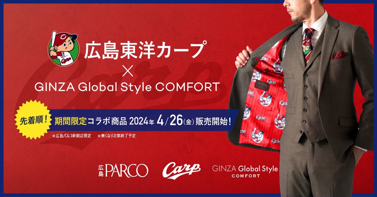 『広島東洋カープ・コラボスーツ』グローバルスタイルは4/26(金)よりコラボ商品を「広島パルコ新館店」限定で販売開始。昨年大好評だったコラボが今年も実現!