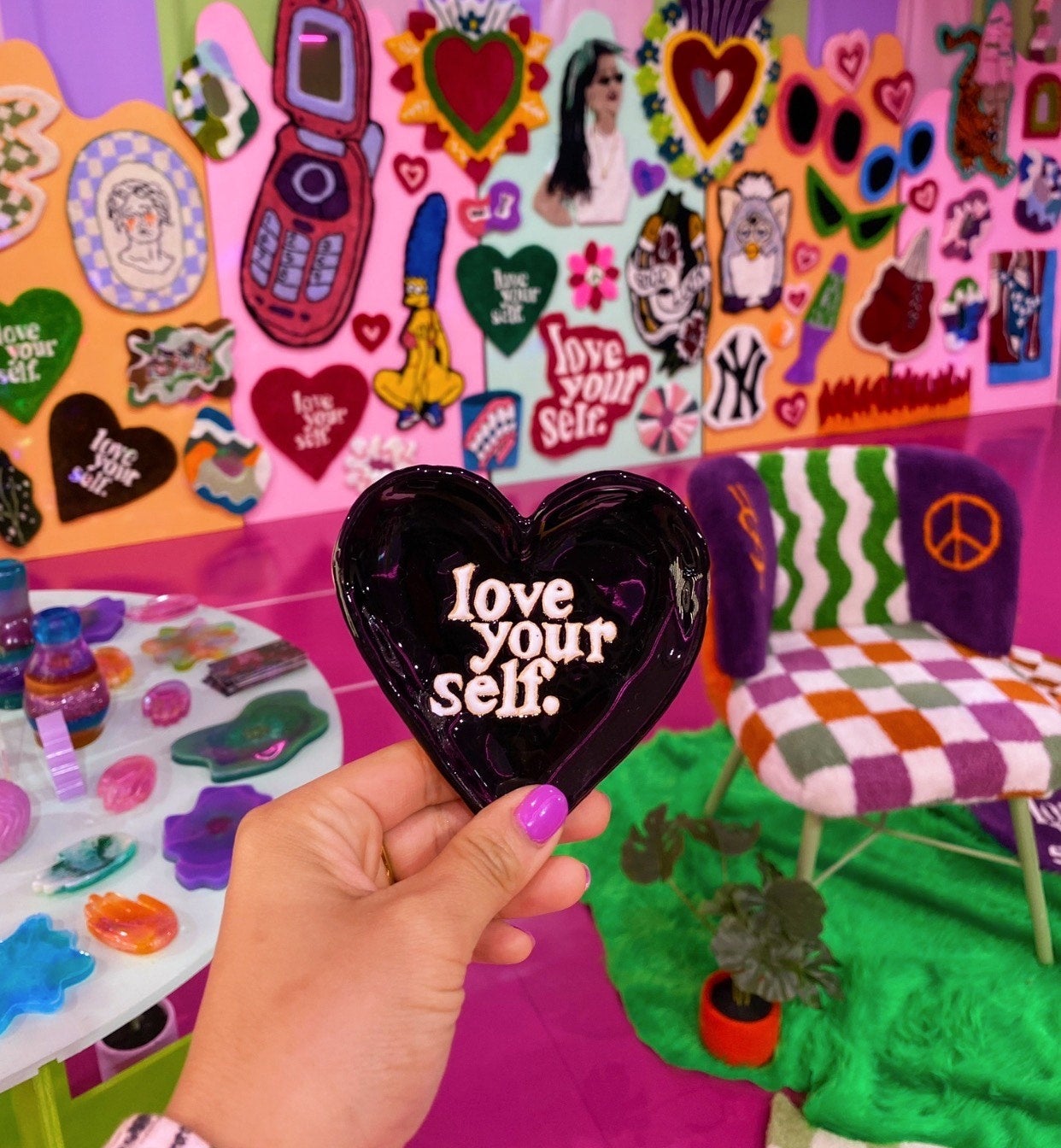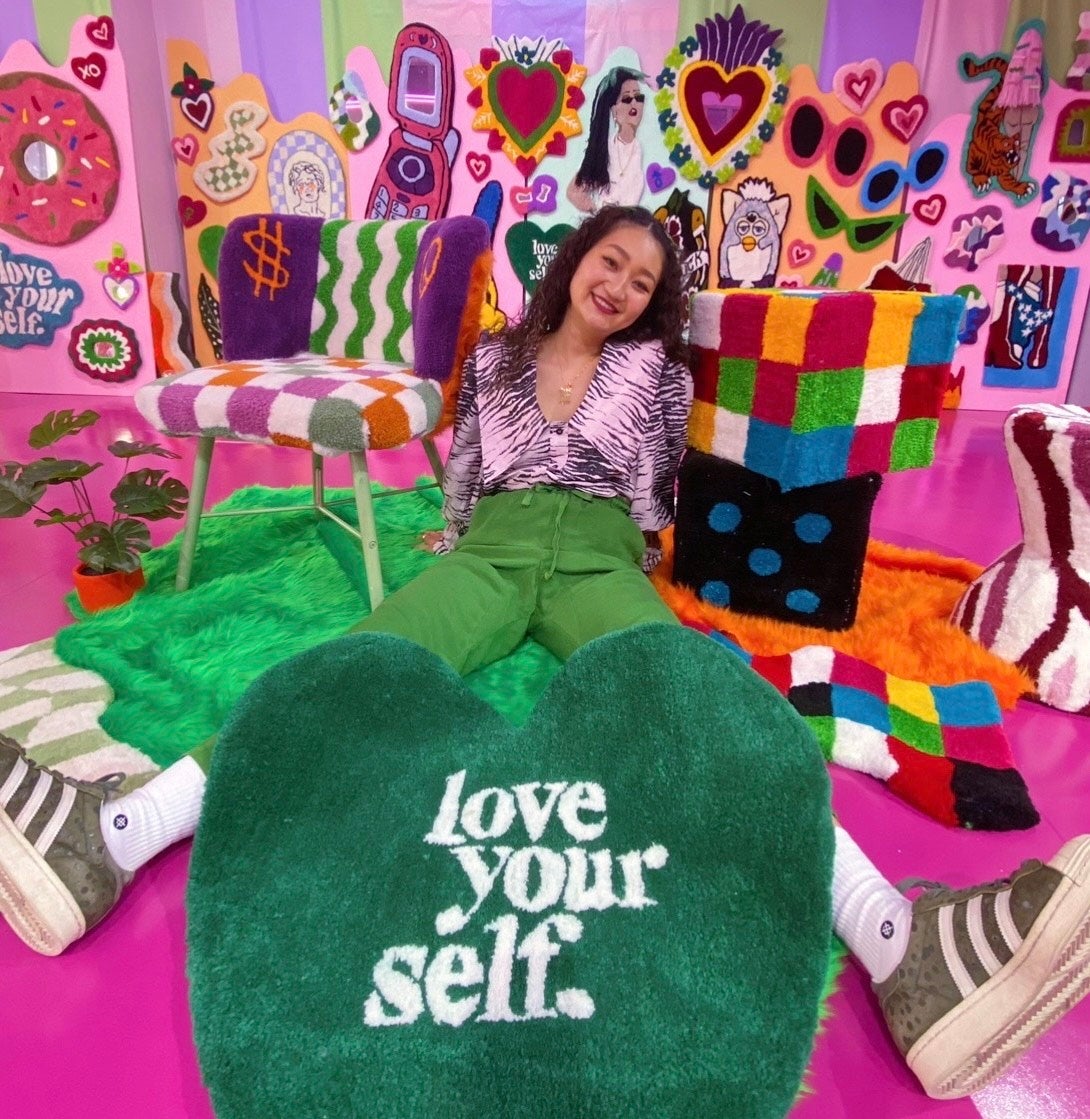 タフティングやレジン、陶器など様々な⼿法を⽤いて作品を⽣み出すアーティスト。 ”⾃分を好きになってハッピーになろう!”と⾔うメッセージがこもったlove yourself のロゴが彼⼥の象徴的なデザイン。