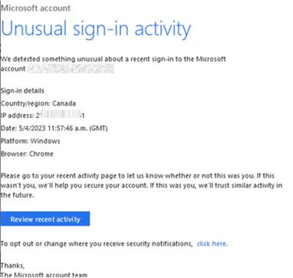 2023年第2四半期、Microsoftアカウントの保有者を標的とし、不審なサインインアクティビティがあったという虚偽のメッセージを送信するフィッシングキャンペーンが確認されました。
