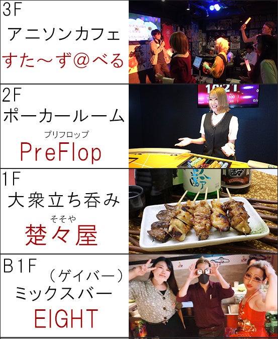 ビルのリニューアルと同時に弊社の新業態・新規店舗として、ポーカールーム「PreFlop YOKOHAMA(プリフロップ ヨコハマ)」をオープンいたします。これにより、ビルのフロア構成は、地下1階にミックスバー(ゲイバー)、1階に立ち飲み焼き鳥屋、2階にポーカールーム、3階にアニソン専門カラオケカフェといった、自社で運営する店舗が集まり、他の施設では中々体験できることのない「大人の未体験ゾーン」として、各店舗協力関係を築きながら、深夜、朝まで営業しております。