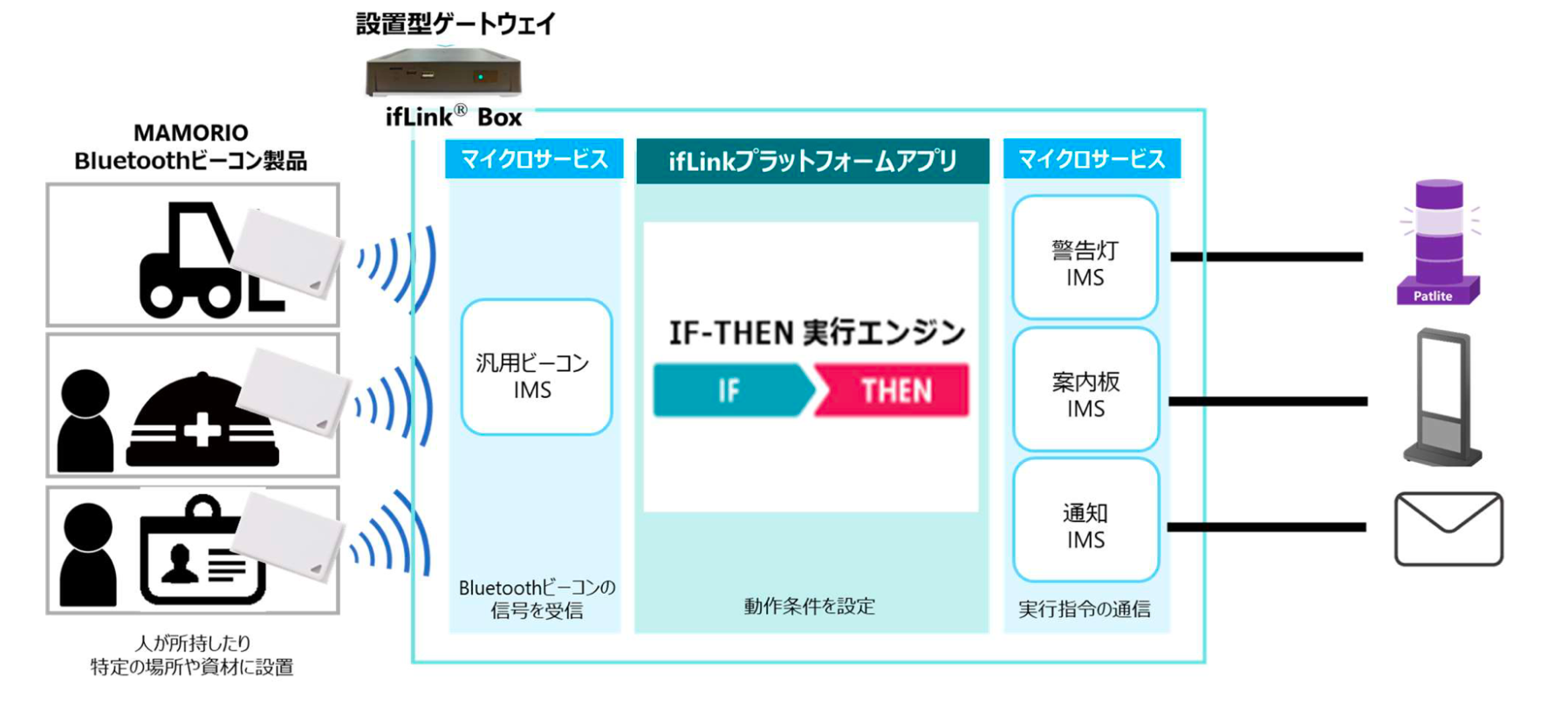 「MAMORIO.biz works with ifLink」では、MAMORIO社が提供する各種ビーコンを人に所持させたり、業務車両に設置することで、それらのビーコン信号を受信した際に、ifLink対応のデバイスやWebサービスと連動した通知や表示を動作させることができます。