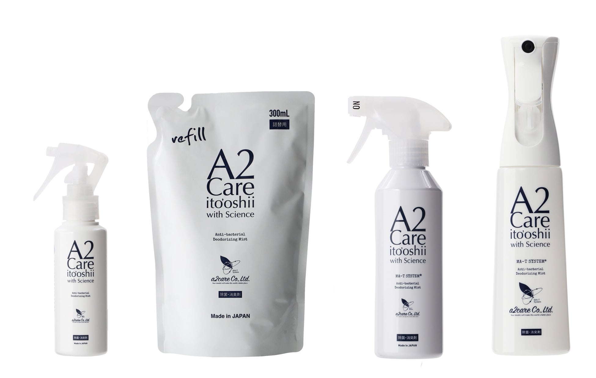 「A2Care」は、高い安全性を保ちながら、優れた除菌消臭作用をもつ無色、無臭の除菌消臭剤。その成分は精製水99.9% 、だから、ベタつかず、布製品も傷めません。ANAをはじめとした航空会社の機内や空港ラウンジなどの除菌・消臭に使用されて、全国のインテリアショップ等にて「A2Care」シリーズを販売しています。